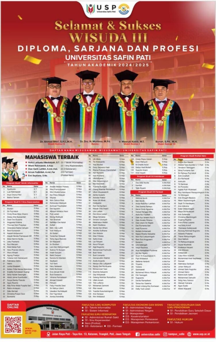 Pati – Jurnaljatengdiynews.com. Universitas Safin Pati kembali mencatatkan momen penting dalam perjalanan akademiknya dengan menyelenggarakan wisuda bagi 224 mahasiswa dari Program Diploma, Sarjana, dan Profesi Ners. ( 15-10-2025).